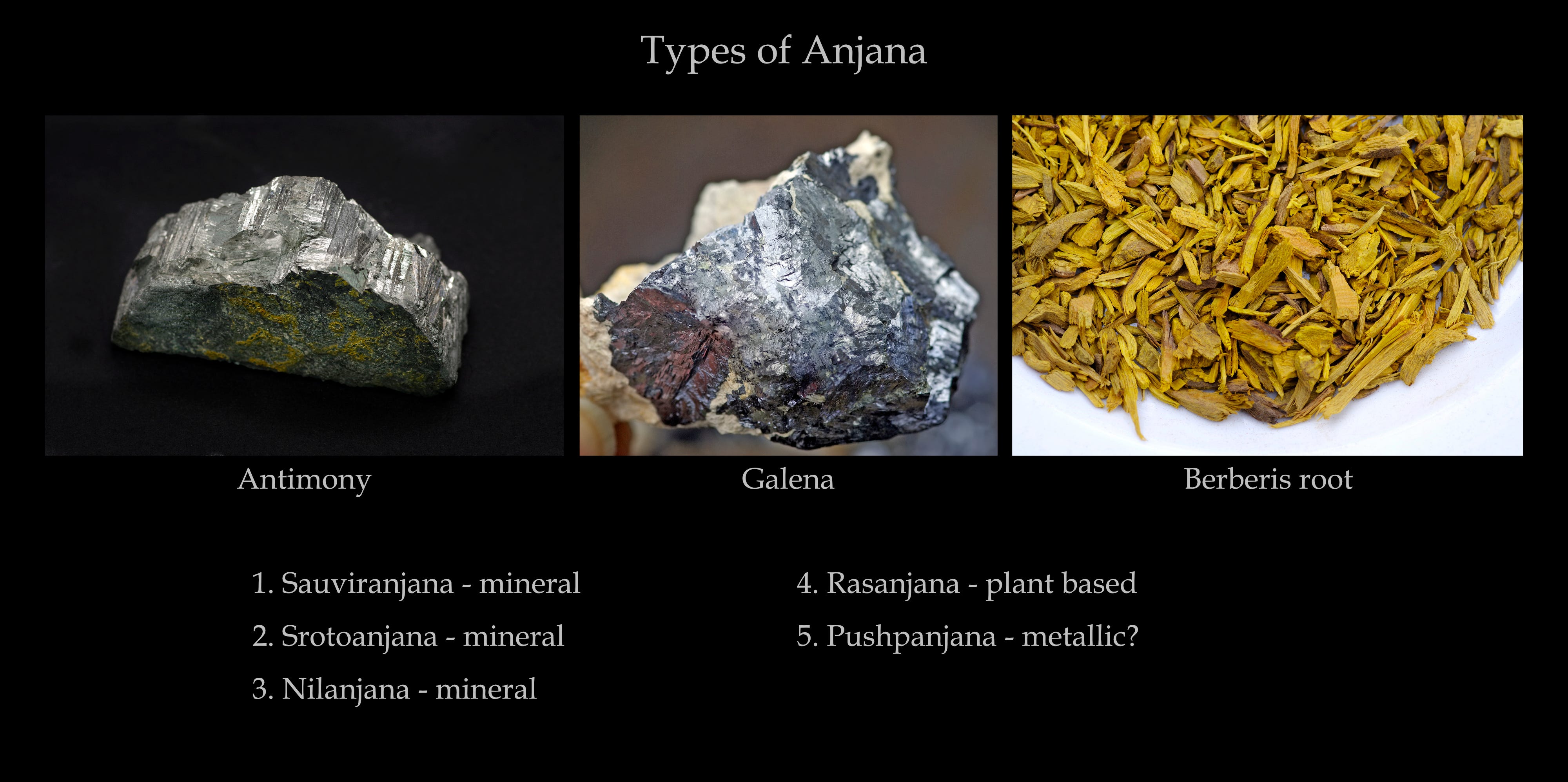 In Rasa Shastra and Ayurveda, antimony is called Anjana. The name most commonly refers to its ancient use as a collyrium (the black kohl applied to the eyes), but it also appears in numerous medicinal preparations as a carefully prepared bhasma (calcined ash).